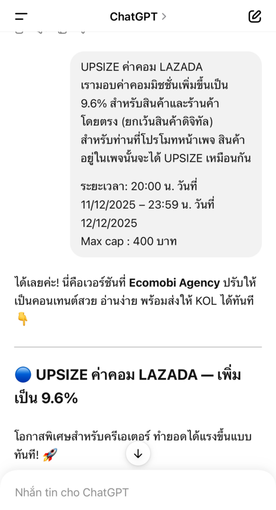 “Viết bài quảng bá Shopee cho KOL, giọng thân thiện, tập trung vào hoa hồng và thời gian chiến dịch”…..
