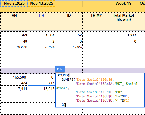 Ví dụ: thay vì dùng hàm SUM để cộng các data từ sheet khác, nhờ GPT team đã đổi sang hàm ROUND(SUMIFS để tìm kiếm data theo điều kiện phù hợp. Chú ý cần điền đúng các trường thông tin để hàm có thể tự động đếm số lượng