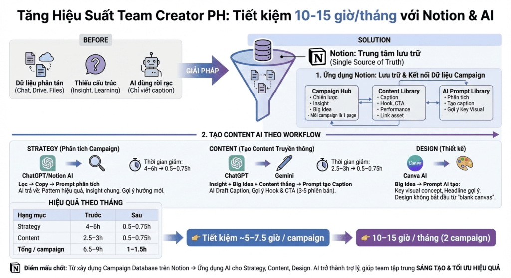 Bằng cách xây dựng Campaign Database trên Notion và ứng dụng các công cụ AI ở từng bước cụ thể trong quy trình làm việc, Team Creator – Affiliate Philippines có thể tiết kiệm 10–15 giờ làm việc mỗi tháng với tần suất 2 campaign/tháng, đồng thời nâng cao tính nhất quán và khả năng tái sử dụng nội dung.