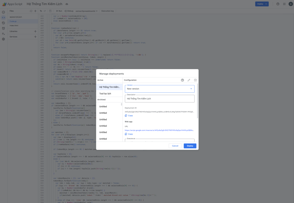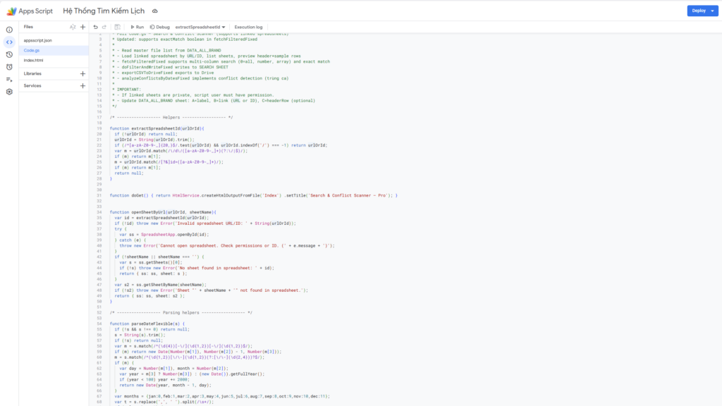 Giao diện Apps Script với Code.gs của Hệ Thống Tìm Kiếm Lịch