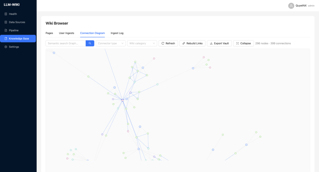 - Nguồn dữ liệu được ingest thành các trang wiki có slug, category, summary, tags.