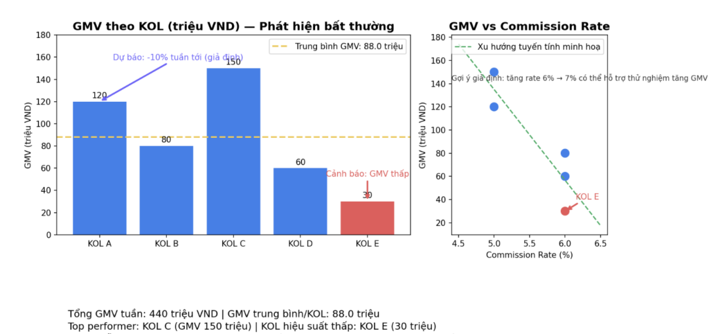 - “KOL E hiện có GMV thấp (30 triệu) với Commission Rate 6%. Đề xuất thử nghiệm tăng lên 7% để kỳ vọng GMV tăng ~20%.”