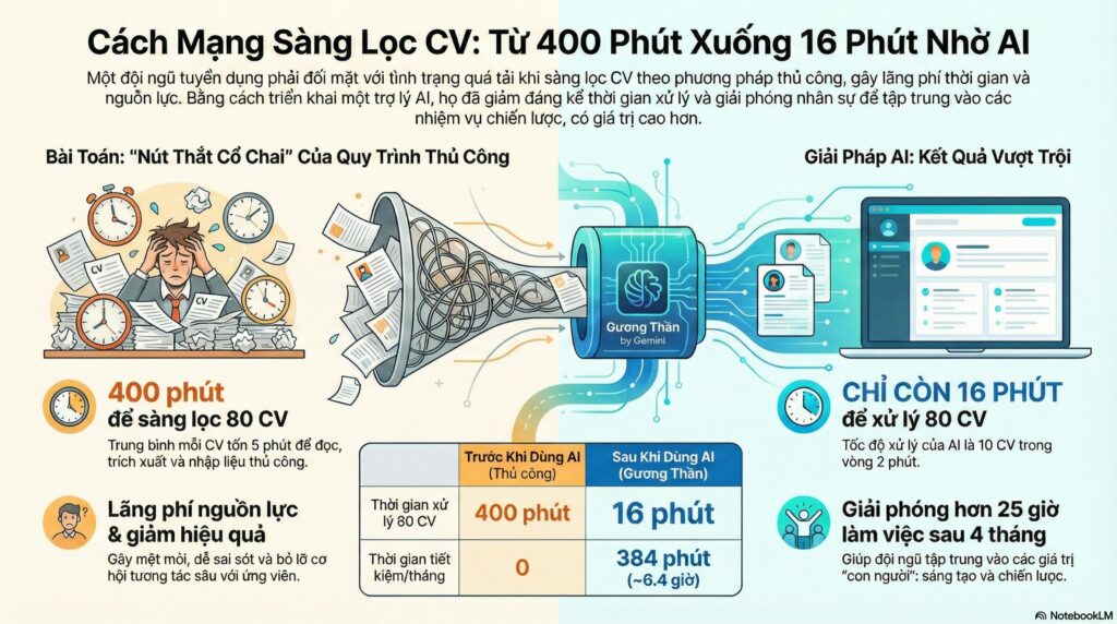 Nếu phần sáng tạo content là “bề nổi”, thì việc xử lý CV là “tảng băng chìm” bào mòn sức lực. Trước đây, 3 nhân sự TA của chúng tôi tiêu tốn trung bình 400 phút mỗi tháng chỉ để xử lý thủ công 80 CV (5 phút cho mỗi CV để đọc, trích xuất và nhập liệu).