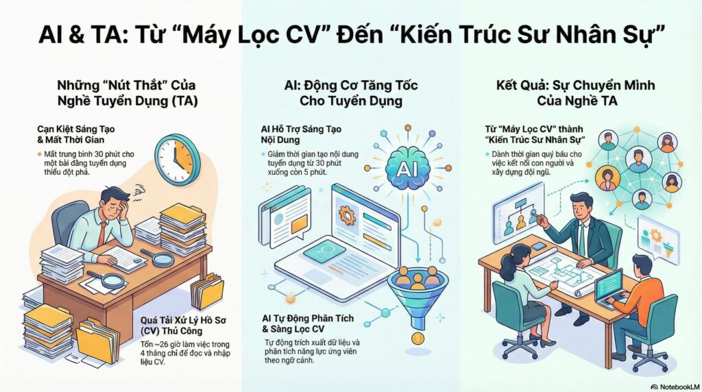 Sự kết hợp giữa NotebookLM (Sáng tạo nội dung) và Gương thần AI Agent (Xử lý dữ liệu) đã thay đổi hoàn toàn định nghĩa về nghề TA tại công ty chúng tôi. Chúng tôi không còn là những “máy lọc CV” chạy bằng cơm, mà đã trở thành những Kiến trúc sư nhân sự – những người dùng công nghệ để xây dựng đội ngũ và dành thời gian quý báu cho những kết nối thực sự giữa con người với con người.